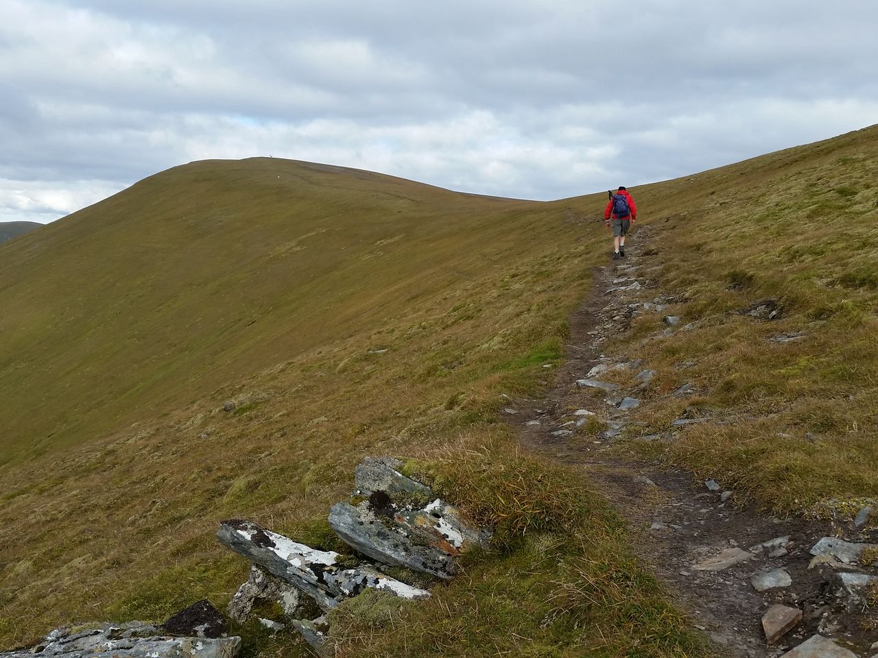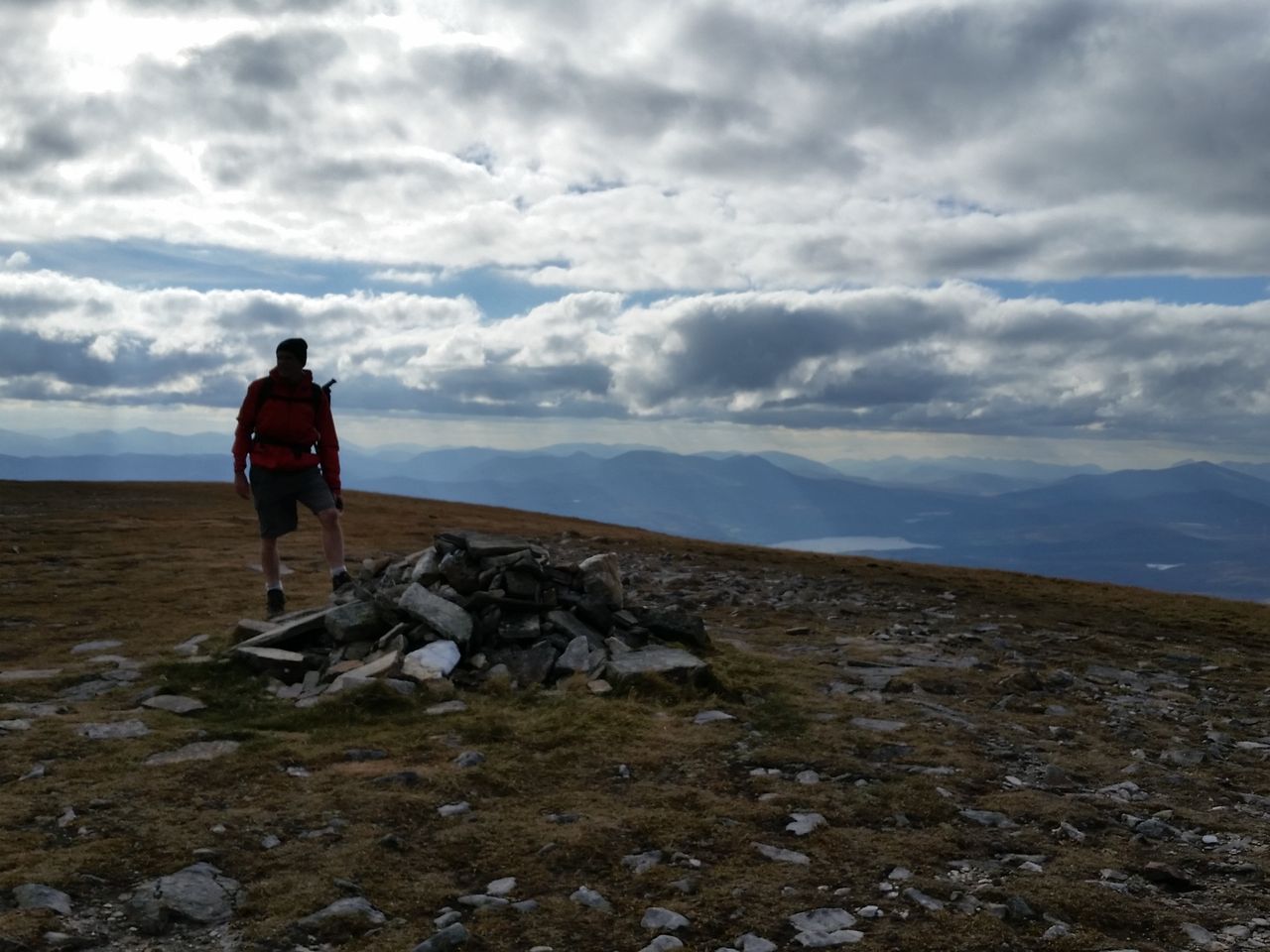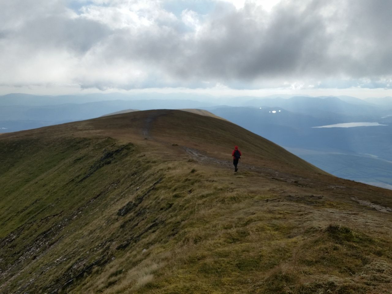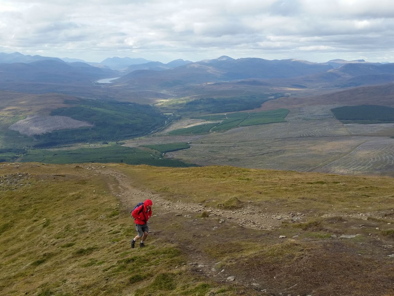 Sat on top having switched to shorts for the ascent, it really was that warm. After refueling we set off to cross the Ben Alder plateau, no place to be in deteriorating weather of course, but remember there was no chance of rain, actually it did look a bit dark in the west but we ignored this and carried on. We successfully traversed the plateau which unsurprisingly was flat, as plateaus tend to be hence the name. Then onwards curving east and up towards the second Munro, Beinn Bheoil.
