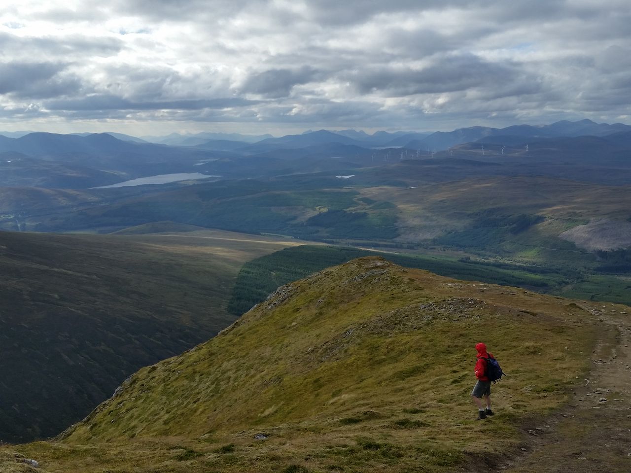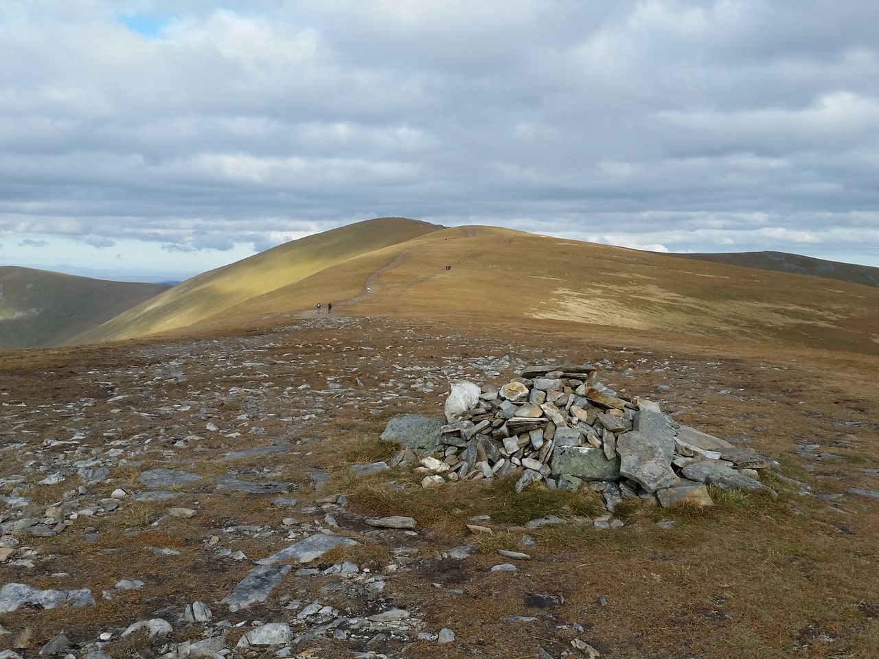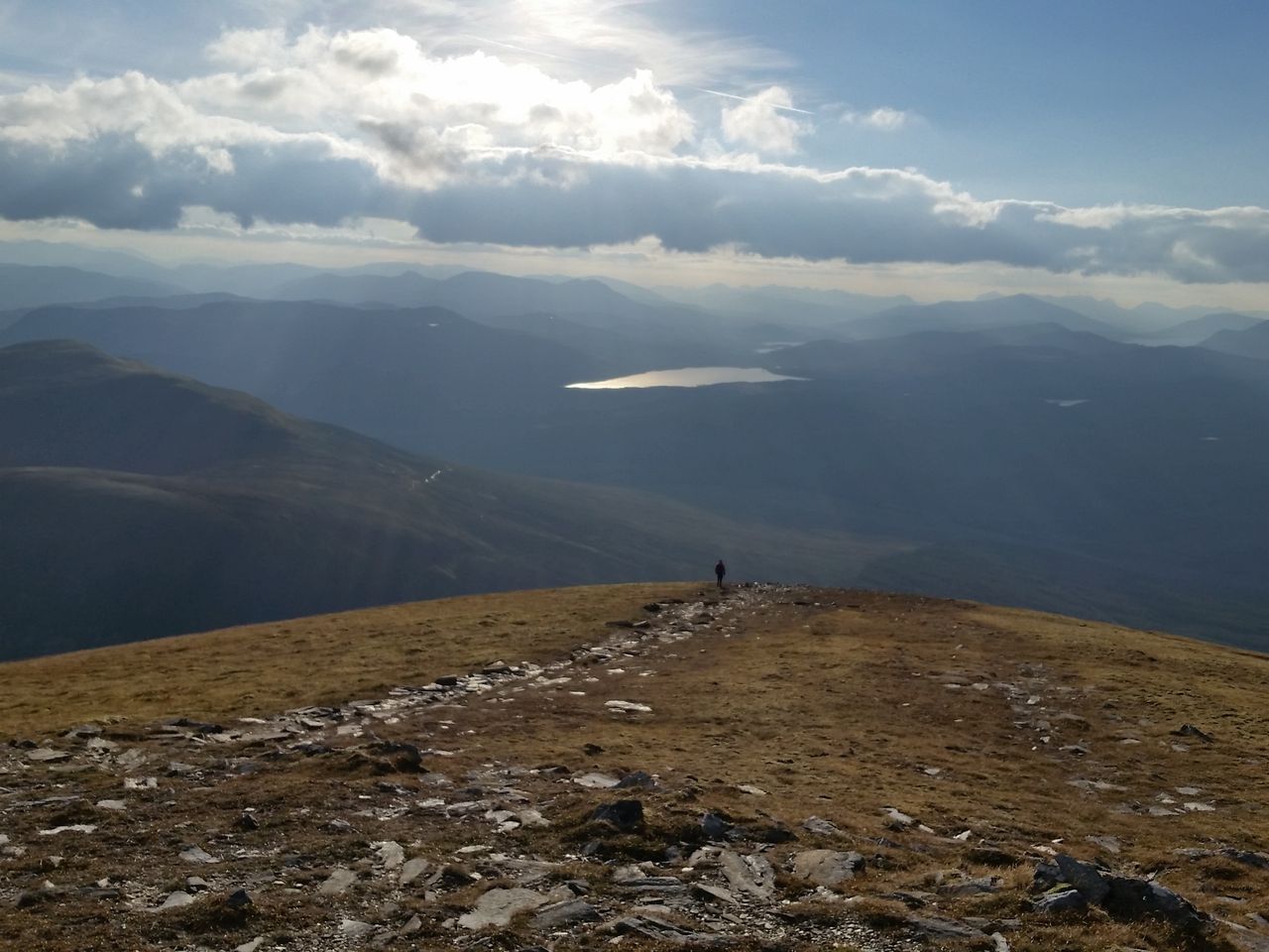 Sat on top having switched to shorts for the ascent, it really was that warm. After refueling we set off to cross the Ben Alder plateau, no place to be in deteriorating weather of course, but remember there was no chance of rain, actually it did look a bit dark in the west but we ignored this and carried on. We successfully traversed the plateau which unsurprisingly was flat, as plateaus tend to be hence the name. Then onwards curving east and up towards the second Munro, Beinn Bheoil.