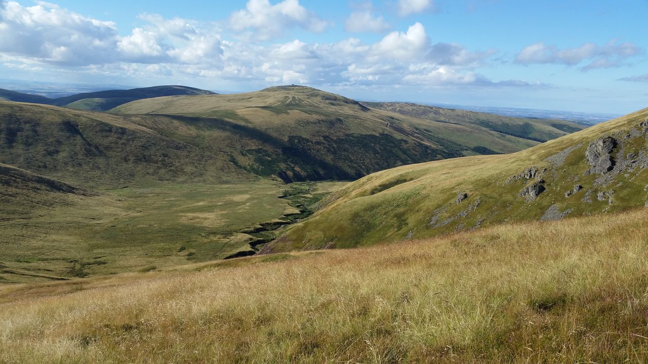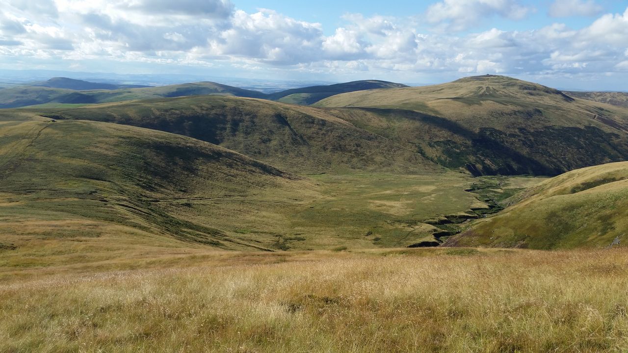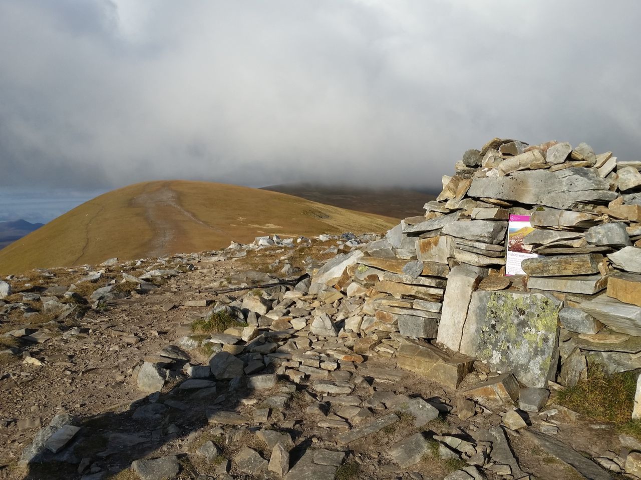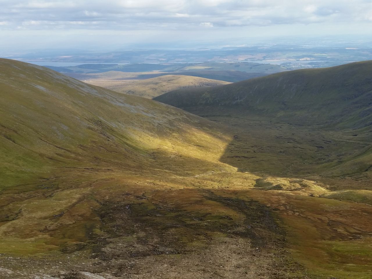 Sat on top having switched to shorts for the ascent, it really was that warm. After refueling we set off to cross the Ben Alder plateau, no place to be in deteriorating weather of course, but remember there was no chance of rain, actually it did look a bit dark in the west but we ignored this and carried on. We successfully traversed the plateau which unsurprisingly was flat, as plateaus tend to be hence the name. Then onwards curving east and up towards the second Munro, Beinn Bheoil.