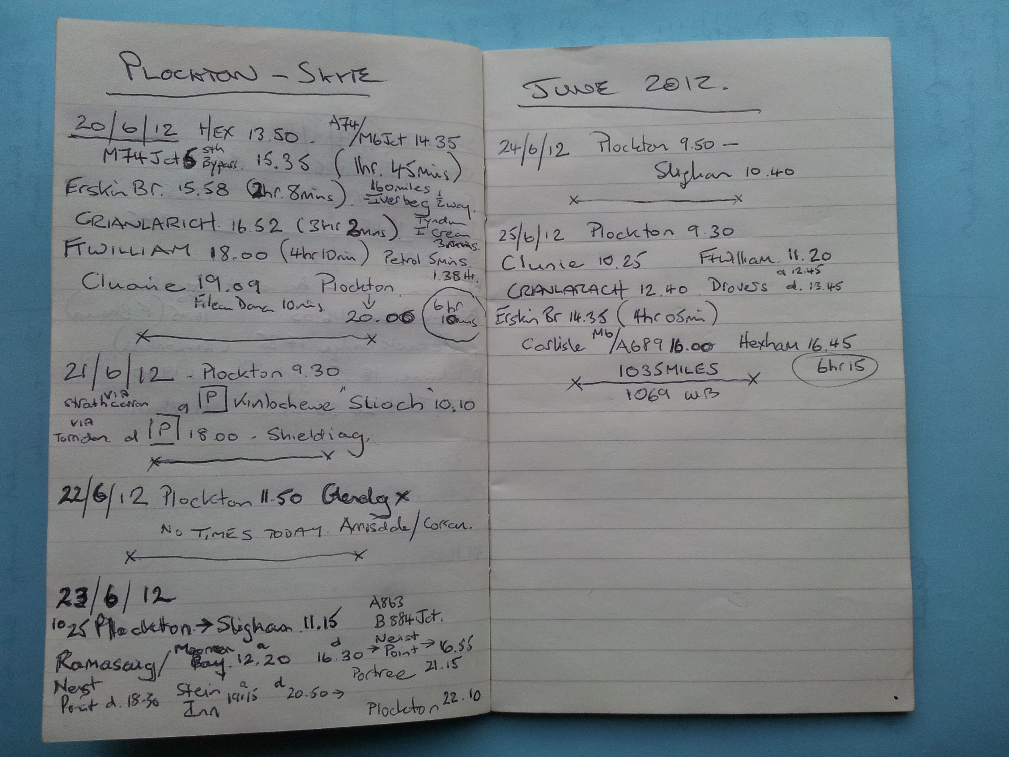 PS; for many years we’ve kept a “Driving Times” record in a little notebook in the glove-box; it’s kinda fun looking back, we even used to give each trip an amusing title. My mate Alan did this one, (more of him later) you can tell he’s an ex train spotter can’t you 🙂