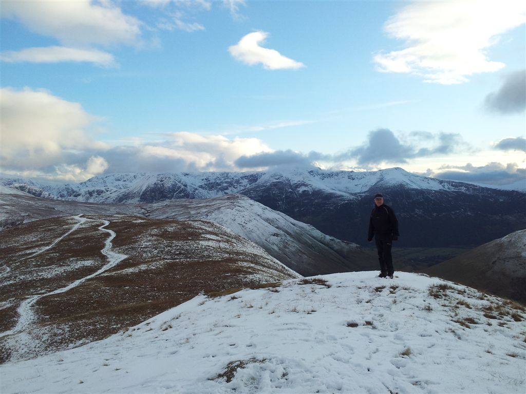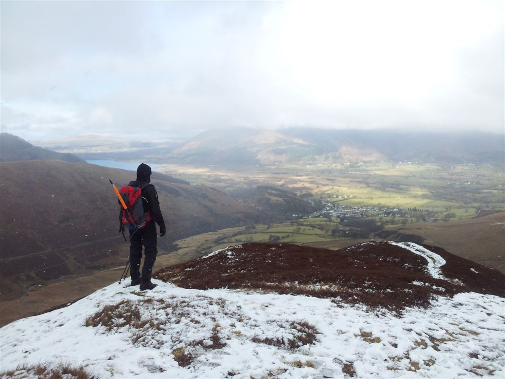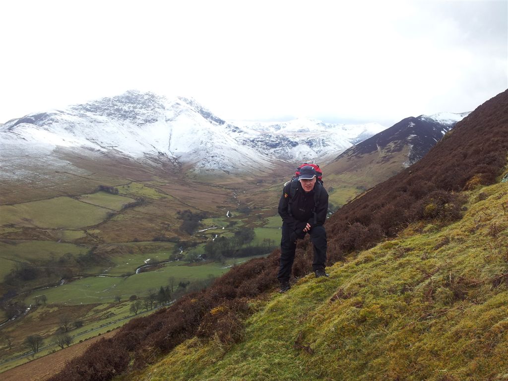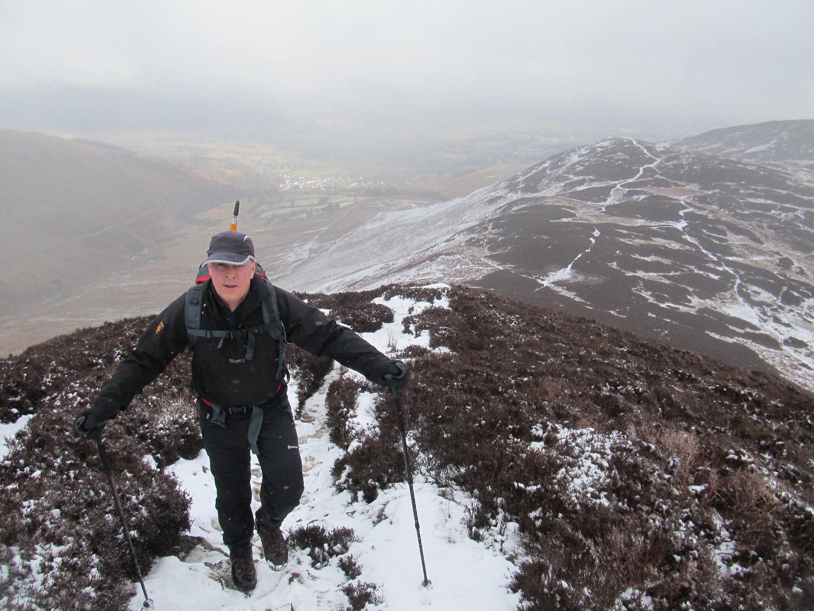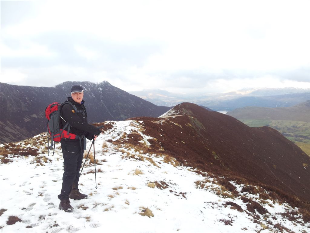 Plan D was to nip up new Wainwrights Barrow & Outerside, then if the weather was ok, carry on up Sail, Crag Hill, Eel Crag & possibly Grsisedale Pike (old Wainwrights), or if poor weather then just do the two Wainwrights then add another new one of either Binsey, Great or Little Meal Fell, (Plan E). We packed axes & crampons then started at 11.50am by heading straight for Outerside instead of up the Barrow ridge necessitating a quick reroute up the side then on to the pleasant little ridge.