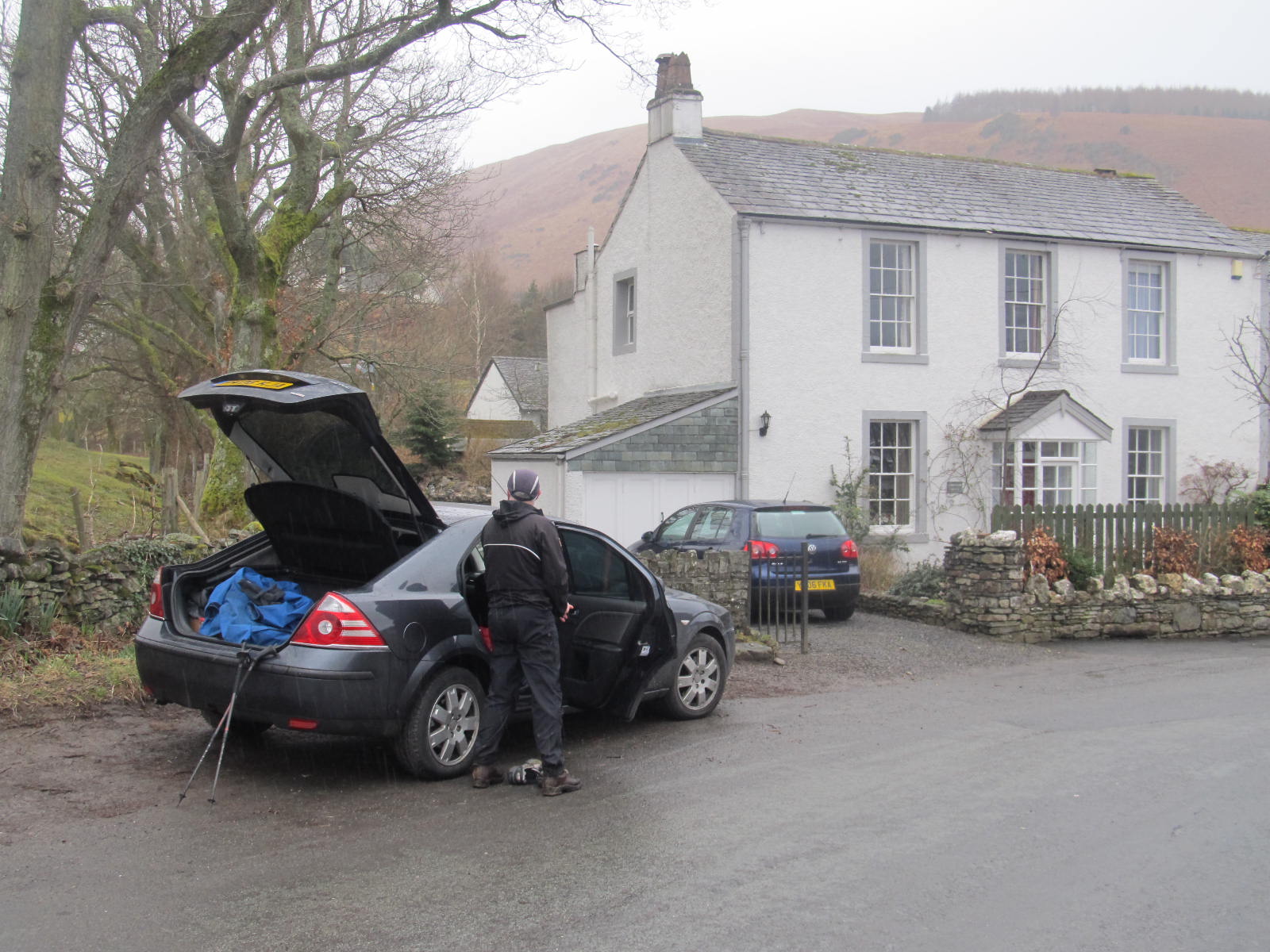 The weather improved slightly then came down again, it was looking like that sort of day. The photos flatter the conditions and as another snow shower closed in we both decided it wasn’t looking much fun up there in the snow clouds & probable ice, so we would retreat. Back to Plan E, we would nip back then drive over to bag a new Wainwright somewhere.