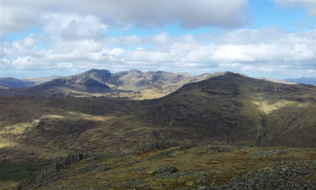 Around a Coniston Round – Great Carrs, Grey Friar, Dow Crag, Coniston Old Man, Brim Fell, Swirl How & Wetherlam – from below the Three Shire Stone