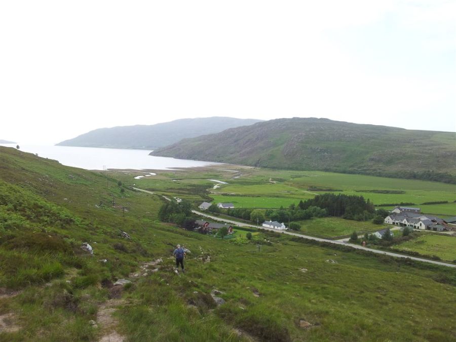 The car is parked past the trees near white Dundonnell Mountain Hut