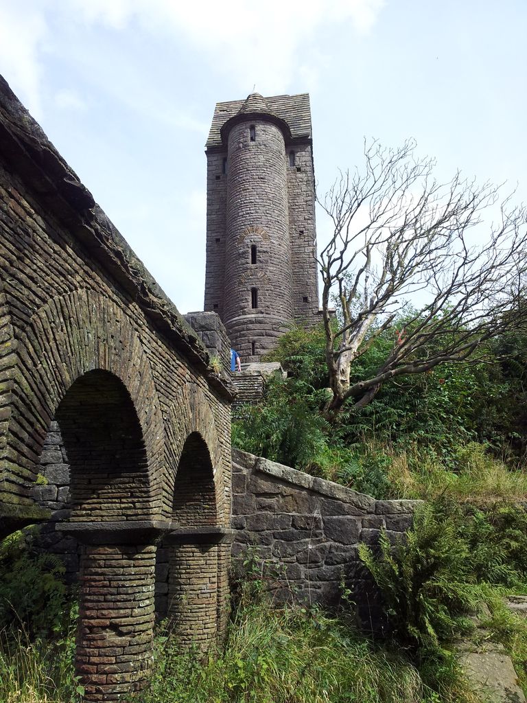 The landmark Pike Tower is a Grade II* listed building on the summit. The tower is square in plan with sides of 16 feet (4.9 m) in length and is 20 feet (6.1 m) high. It was built with a wooden roof, three windows and a door which are now blocked up. The roof was hidden by a parapet with pointed corner and intermediate steps. Inside it retains a fireplace and once had a chimney. Its single room is 13 feet (4.0 m) square with a stone flagged floor and was originally wood panelled. There is a cellar. It was built as hunting lodge in gritstone and was completed in 1733. John Andrews of Rivington Hall built the tower on the site of an old beacon using its stone for the foundations.