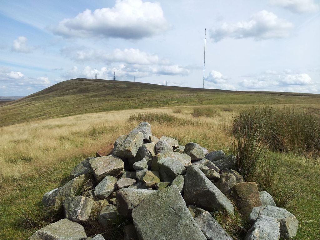 After a quick snack sheltering from a slight breeze behind the main cairn I set off straight for the aerials. There was a hint of damp grass in places before joining the access road.