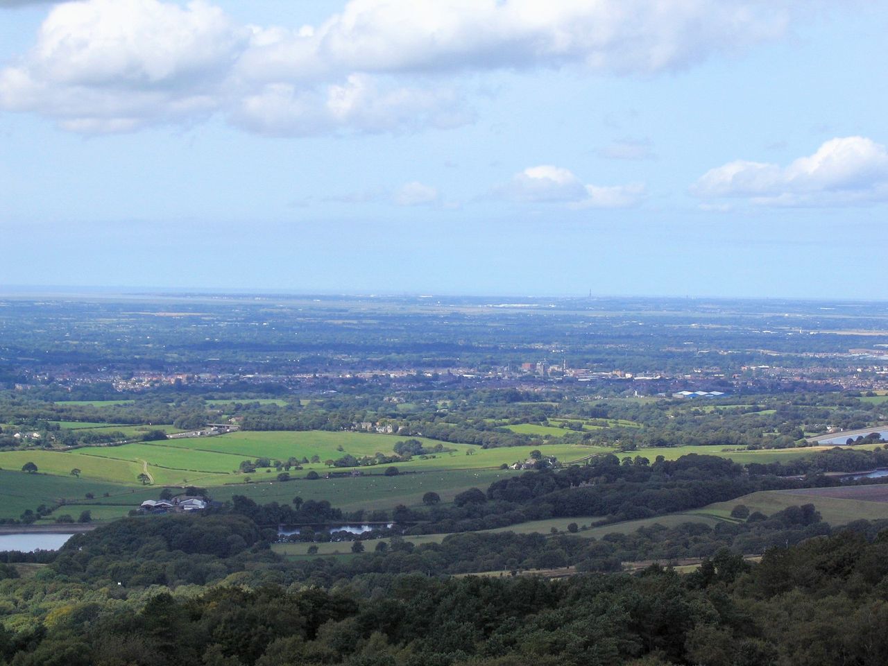 View over Rivington Reservoir with the Wirral beyond, Liverpool top right