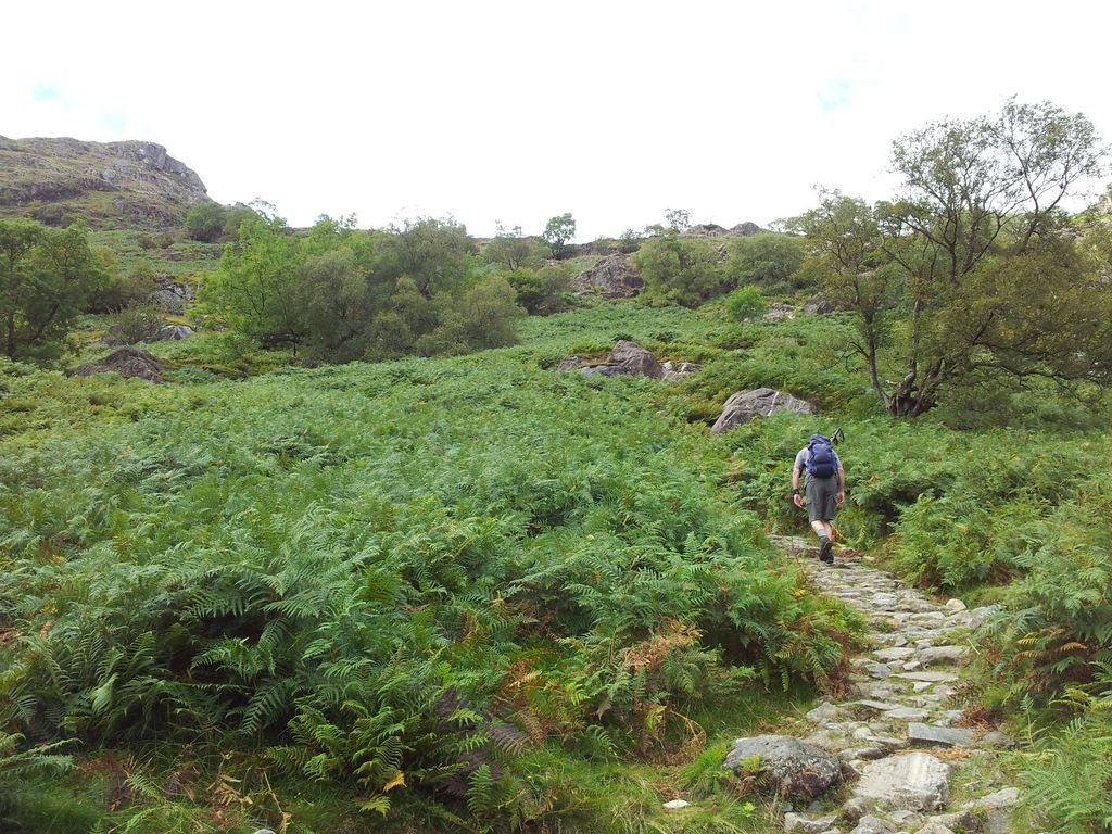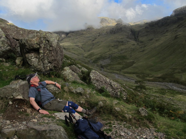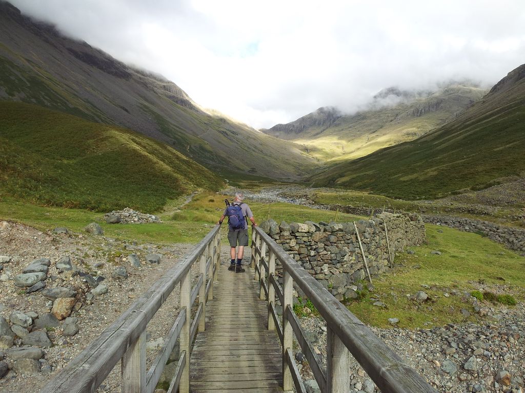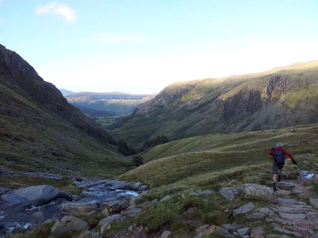 The rather wonderful thing about staying in the hills late is all the other day walkers have already gone down. Apart from a couple camping we were alone at one of the Lakes busiest spots. Then it was the straightforward route easing down Sty Head Pass to Seathwaite. No probs apart from the section before Stockley Bridge which doesn’t agree with my knees.