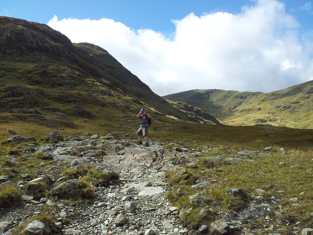 Classic Alanism whilst sat here, the sun went in and Alan immediately started fretting stating, “the weathers definitely turning, theres been a change, it’s a lot darker suddenly, something evil approaching, oh hold on it’s ok I’d just put my sunglasses on”. We have hours of jovial fun together in the hills you know. Now one thing we learnt from doing this Wasdale diversion descent last year from Sca Fell, was that we should only have one pint. This was fully appreciated on the ascent up to Styhead that day. Definitely one pint. Must admit this time that pint was gone quickly. So after 1 + a half pints it was time to turn back to Seathwaite.