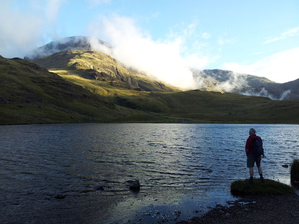 Actually it wasn’t too bad, not one to look forward to after relaxing at the pub but nice knowing its just a little bit further then no more ascent. One hour 35 mins from the pub to Sty Head Tarn. The forecasted evening drizzle hadn’t arrived, Gable was covered in grey cloud yet the Sca Fells were bathed in low golden sunlight with whisps of white cloud dancing across the summit. Was going to get poetic then. Let’s just say it was very nice ok.