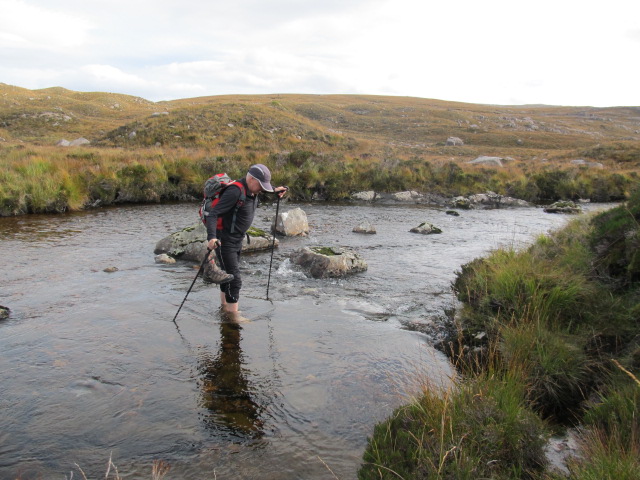 Had almost forgotten one warning for this route that the River Lair may be difficult in spate. This began to look more of a problem than we imagined. The path goes to an obvious looking crossing point with one or two markings nearby suggesting alternatives. None of these looked inviting so we traipsed downstream to see an island but couldn’t be sure what was on the other side. Every hopeful spot had a high slip/fall factor due to the speed of the water. We traipsed upstream and found a flatter area, then looked downstream then upstream again. Each time we considered a crossing the sky darkened so we couldn’t see the river bottom, then a noisy gust of wind would blow reminding us that this whole trip might be in vain if we can’t get up top. The options were to turn back, a huge diversion upstream around the loch, or soaked boots. The boots would take ages to dry and this was just the start of the walk on day one. So option 4, boots off and wade it.