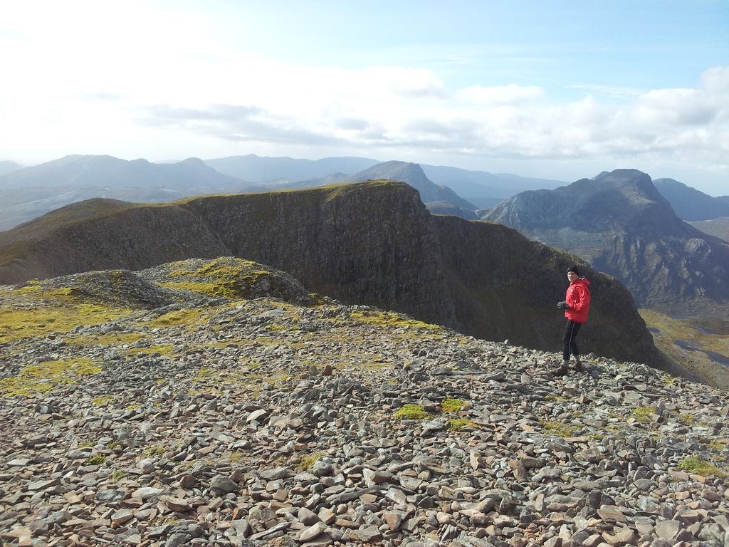 Had a wander around taking advantage of some surprisingly sheltered areas on the summit. Felt lucky to be enjoying all this on day one, we werent really expecting it:-) All good things though, gales were forecasted to increase through the day so after nan inspiring 50 mins we started to head down. Now we were walking straight into the prevailing wind which steadily increased nearing the cairn marking our scree descent to the belach. Buffeting started, much as we wanted to walk out to the top of the buttress the sensible decision had to be to get off that ridge. After only a few feet of descent conditions eased, which made us want to go back up again, sensibly we did not.