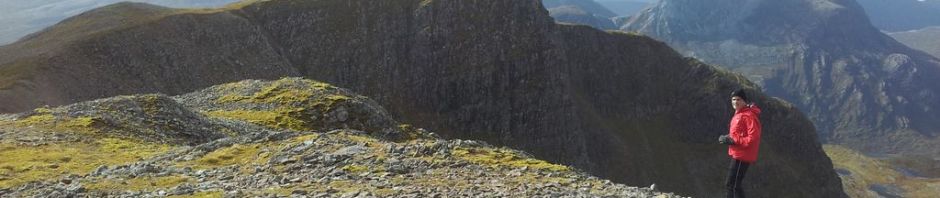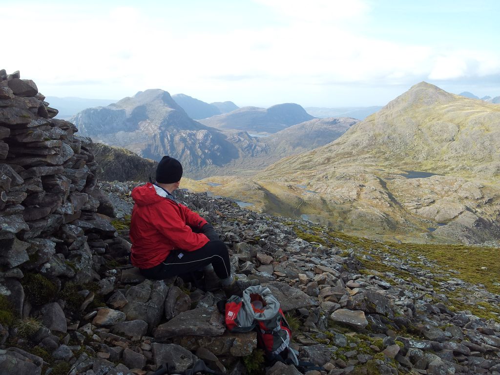 After much weather apprehension on a day when few seemed to be out on the hills, our plan had worked. We had made it without incident to the top, for once I wasn’t blown over and the views were magnificent. It was spot the distant peak time, Torridon, Slioch, An Teallach, to name but a few. Happy time up here.
