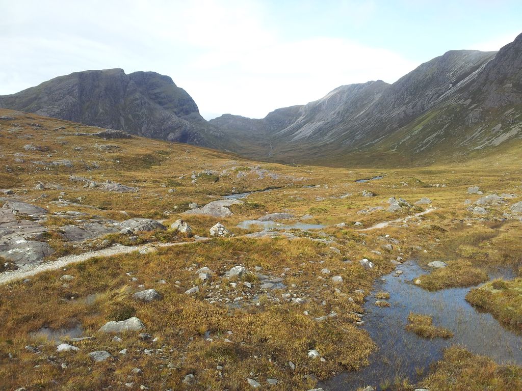 The path soon splits in 3 marked by a small cairn. One continues to follow the river up the valley, a second heads up the right shoulder in the picture above along the skyline of Beinn Liath Mhor for the full circuit. Meanwhile our route heads north west down to the river to access the Corbett from the north. Fuar Tholl was now showing off its brooding side.