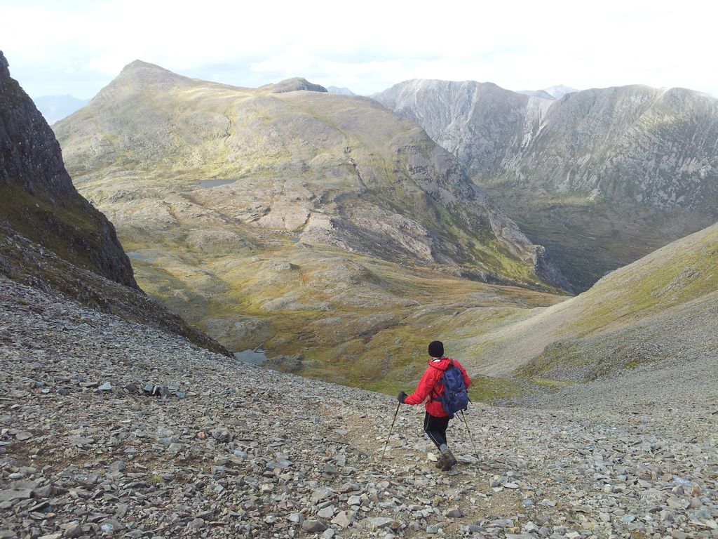 Dominated by the Mainreachan Buttress this is certainly an impressive sight. Our route went up below the left side of the buttress trying to pick the best ground, grass at first eventually joining the scree to the skyline with the summit out of sight left. Was easier than it looked with the occasional old footprint but nothing recent, we were certainly the only one’s up that route for the past few days.