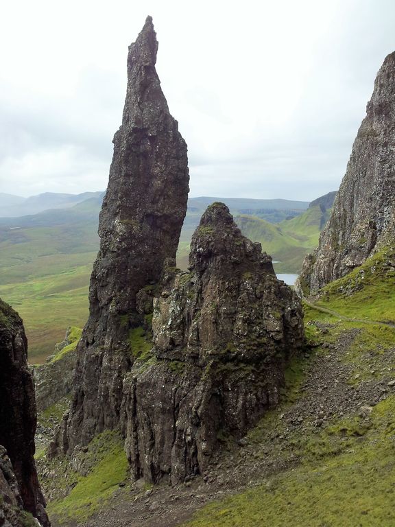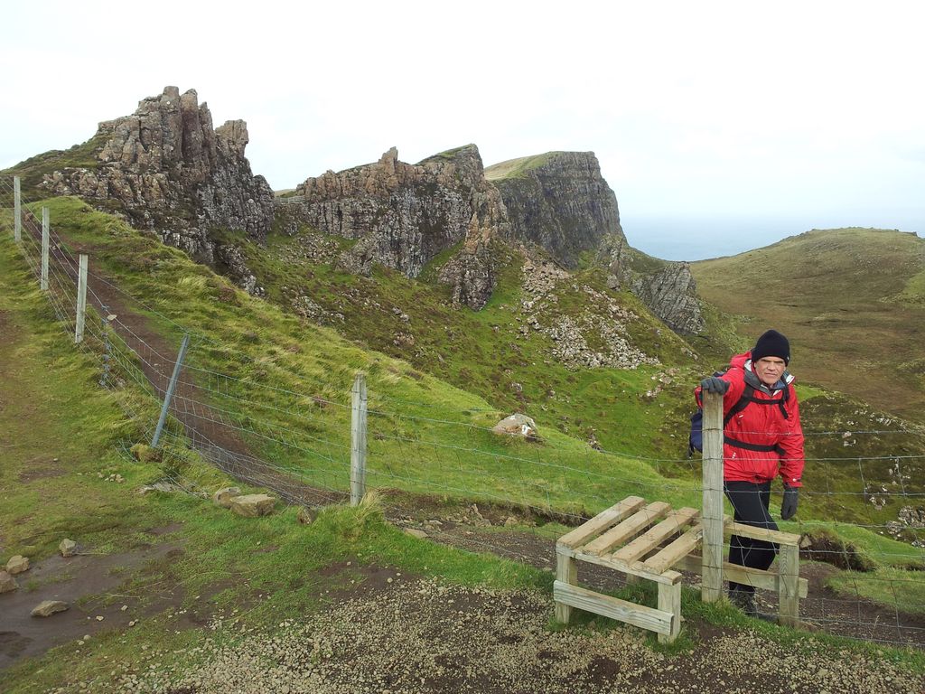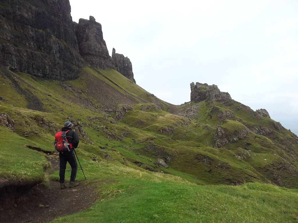 The walk to the Sanctuary on the Storr is a higher ascent than the low path on the Quiraing, but a very straightforward one and provides both easier and more choices to explore its more spacious pinnacled areas. Care still has to be taken in parts but if I was in a family group I’d choose the Storr. Note my description here is only to the area around the Old Man. The longer walk up and around the cliffs to the Storr summit is a different matter and is more suited to hikers. We did it on a greyed out cloudy day with no sight of the Cuillin or mainland, it was ok but you need the views as a reward.