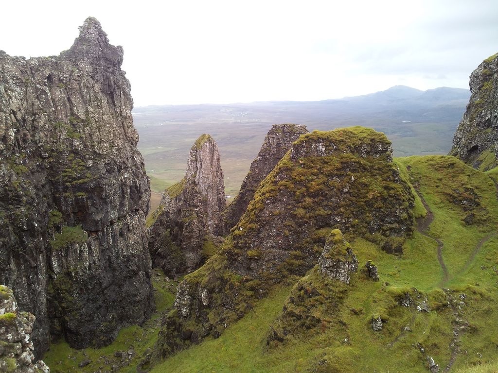 After driving up the A855 we turned off at Brogaig, opposite Staffin Bay, signposted Quiraing & Uig. The car park commands one helluva view across the dramatic east edge of the Trotternish Ridge, a unique jumble of fascinatingly eroded landslips. Breathtaking.