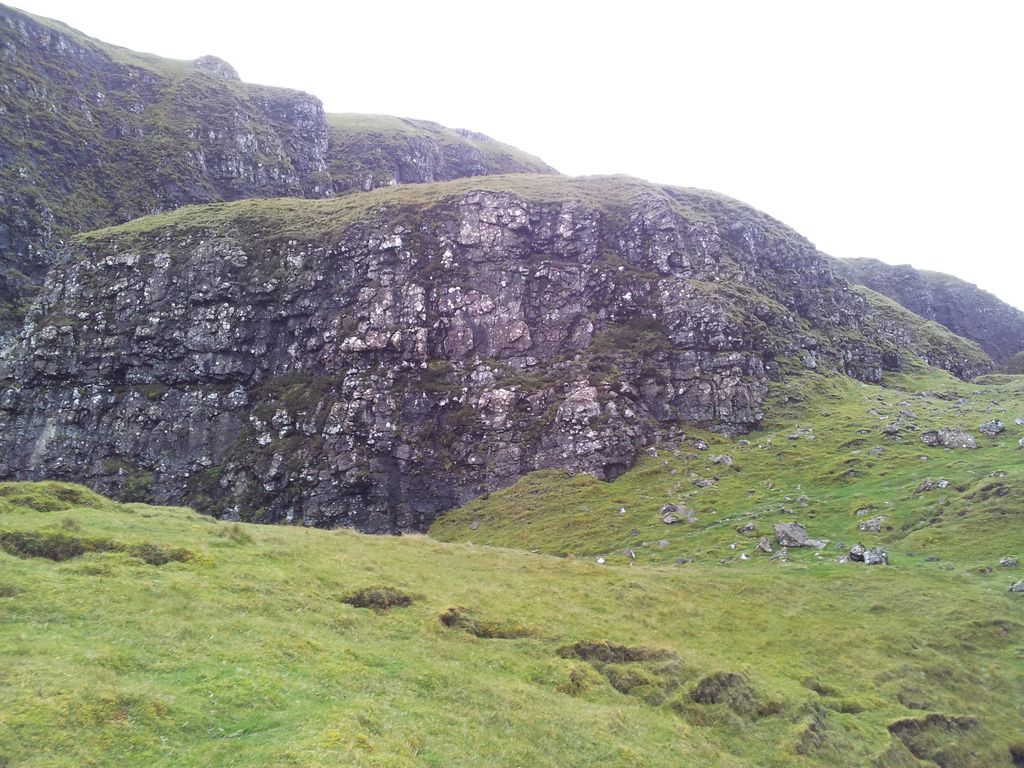 The Table is a section of grass topped volcanic cliff that long ago detached slipping down. Apparently cattle were taken there to be hidden from the Vikings. We saw no cattle and no Vikings in fact no one at all down there. Hoped to be standing on that grassy mound later. Soon the path swings north and we passed up an opportunity to divert inland to the uninviting looking trig point of Meall na Suiramach. This is in fact the highest point in this area and apparently despite the flattish ground gives views to the north and west of Skye. We carried on skirting the cliffs along the path which started gently losing height whilst providing an impressive panorama over the east coast. On a clearer day the north west mainland would look wonderful from up here.