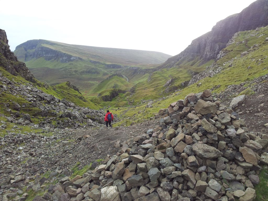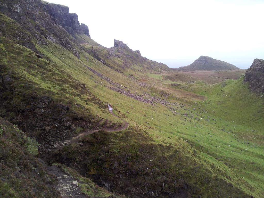 The Quiraing is a harder route in my opinion with paths traversing steeper grassy slopes & a rock gully step across a burn which would stop some families especially in spate or iced. There seems to be a lower car park which would involve more ascent but misses out the bad step. Trying to get up to the hidden pinnacled area is harder than it looks and has to be reversed, so most people stay on the lower path. For a hiker it’s an excellent circular walk using both paths which can be done either way, with an option to Sron Vourllin.