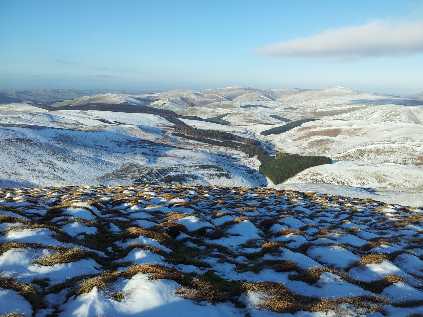 Time to leave the high ground and turn south for the slow descent back, firstly the featureless plateau between the forests before dropping down by Hazely Law. Walking down this section was mostly hilarious with the snow holding most but not all footsteps with just a few crashing through to bowl you over.