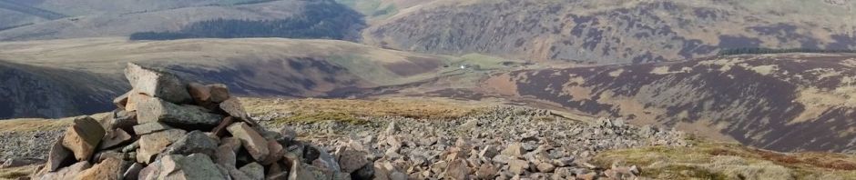 According to Wikipedia; “The view is obscured greatly by the flatness of the summit plateau. Nevertheless, on a clear day the following are visible (from west, clockwise); Broad Law, Moorfoot Hills, Pentland Hills, the Ochils, Lammermuir Hills, Lochnagar, Ros Hill, Long Crag, Urra Moor, Tosson Hill, Burnhope Seat, Cross Fell, Helvellyn, Scafell Pike, Skiddaw, Sighty Crag, Peel Fell, Queensberry“.