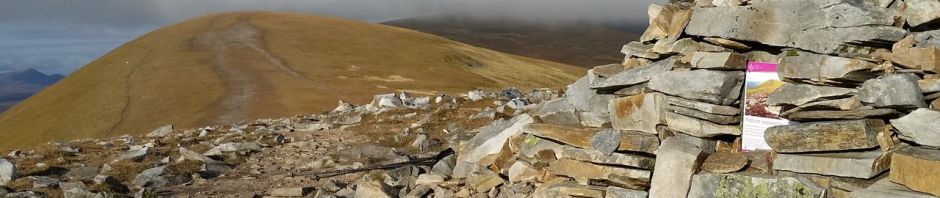 We reached An Cabar, the southern top that we’d bypassed on the way up. Fixed to the cairn was an information board asking walkers to avoid erosion and keep to a suggested line. Bit late for us but interesting information, Wyvis is a National Nature Reserve with rare mosses, plants and Dotterel (see link at the end).