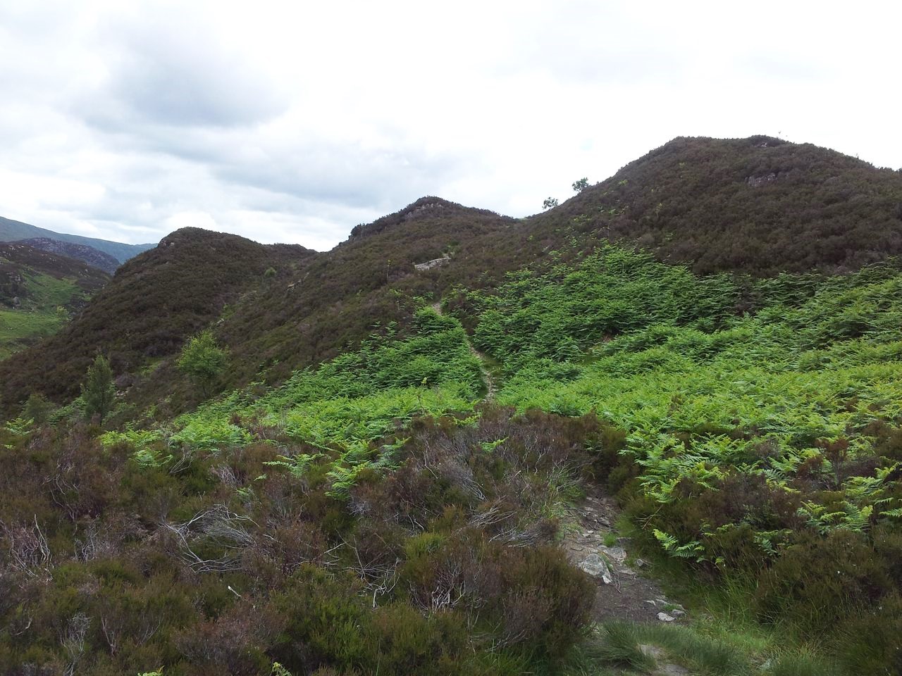 The track continues to gently rise up to another fork where I beared left, passing various inviting paths branching off which may hopefully be explored some other time. Soon the trees lessen and the landscape opens up in the photo below.