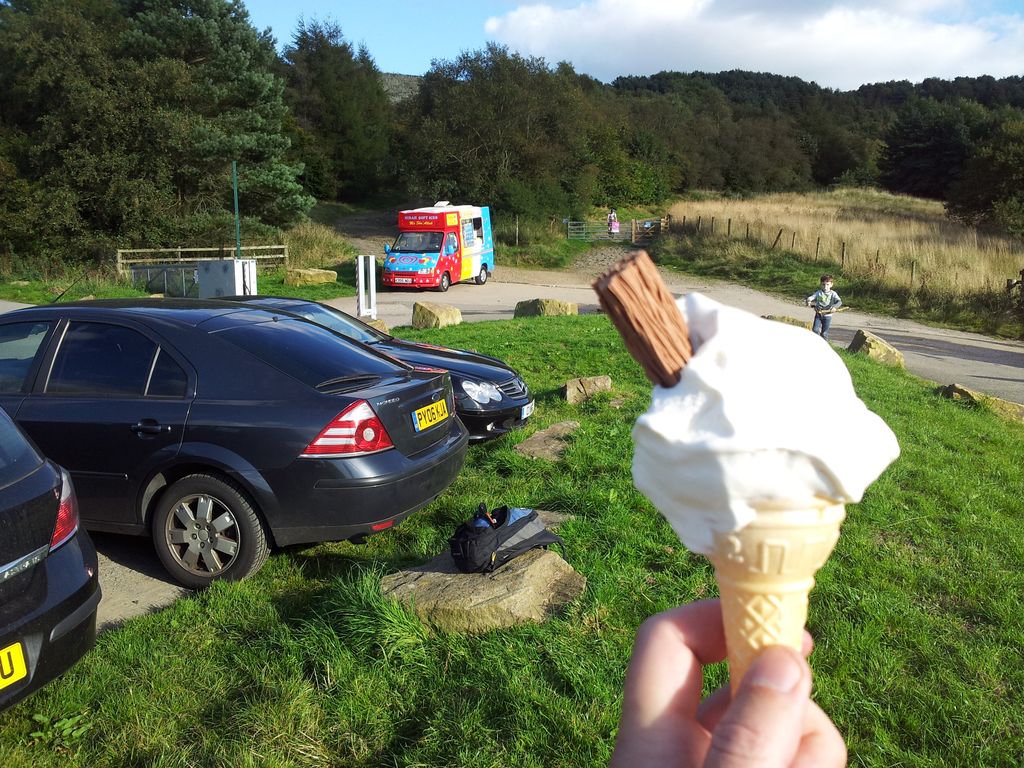 It’s a great track to finish, gently descending to Lower House car park, where my keen senses detected an ICE CREAM VAN ALERT. The van was about to leave and I consumed his last cone of the day, sweet.