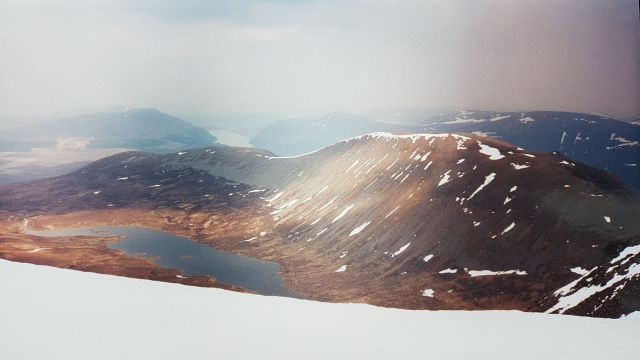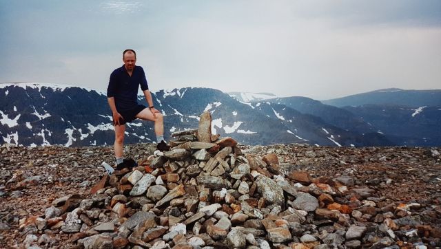 Sat on top having switched to shorts for the ascent, it really was that warm. After refueling we set off to cross the Ben Alder plateau, no place to be in deteriorating weather of course, but remember there was no chance of rain, actually it did look a bit dark in the west but we ignored this and carried on. We successfully traversed the plateau which unsurprisingly was flat, as plateaus tend to be hence the name. Then onwards curving east and up towards the second Munro, Beinn Bheoil.