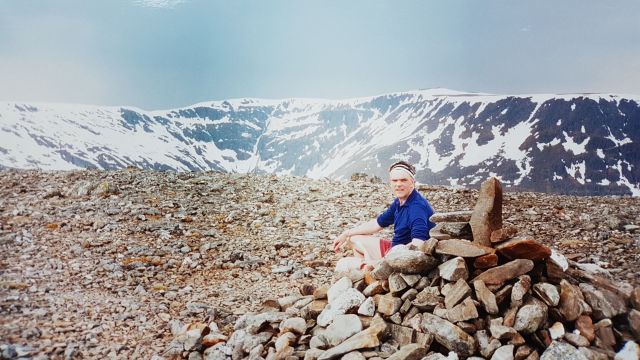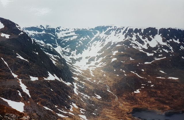 We took the Long Leaches ridge which turned out simpler than it looked, little memory except that it involved some scrambling, eventually reaching a flat top then on to a cairn with a trig marking the highest point. Disappointing ‘summit’ for such an impressive mountain, a big bulky massif with nice sides. We were happy though having reached our goal, always a satisfying moment just a pity about the longed for views. Unfortunately we couldn’t see far at all, hardly anything west no Rannoch Moor, Glencoe, Nevis range etc which was a big disappointment.